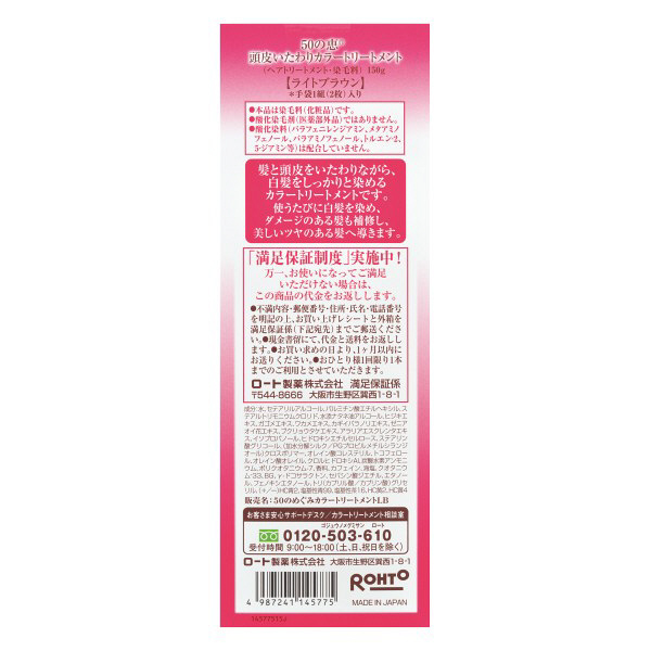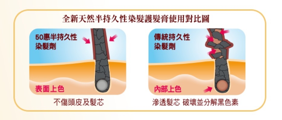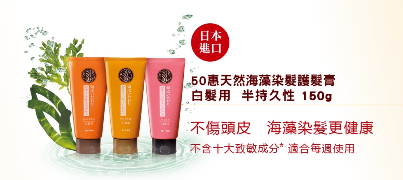 傳統染髮劑較刺激頭皮,經常使用容易令頭髮變得乾旱無光澤,甚至掉髮增多。日本50惠嶄新研出半持久性。天然海藻染髮護髮膏,配方含天然成分,性質溫和,不傷頭皮及髮芯,適合每週使用