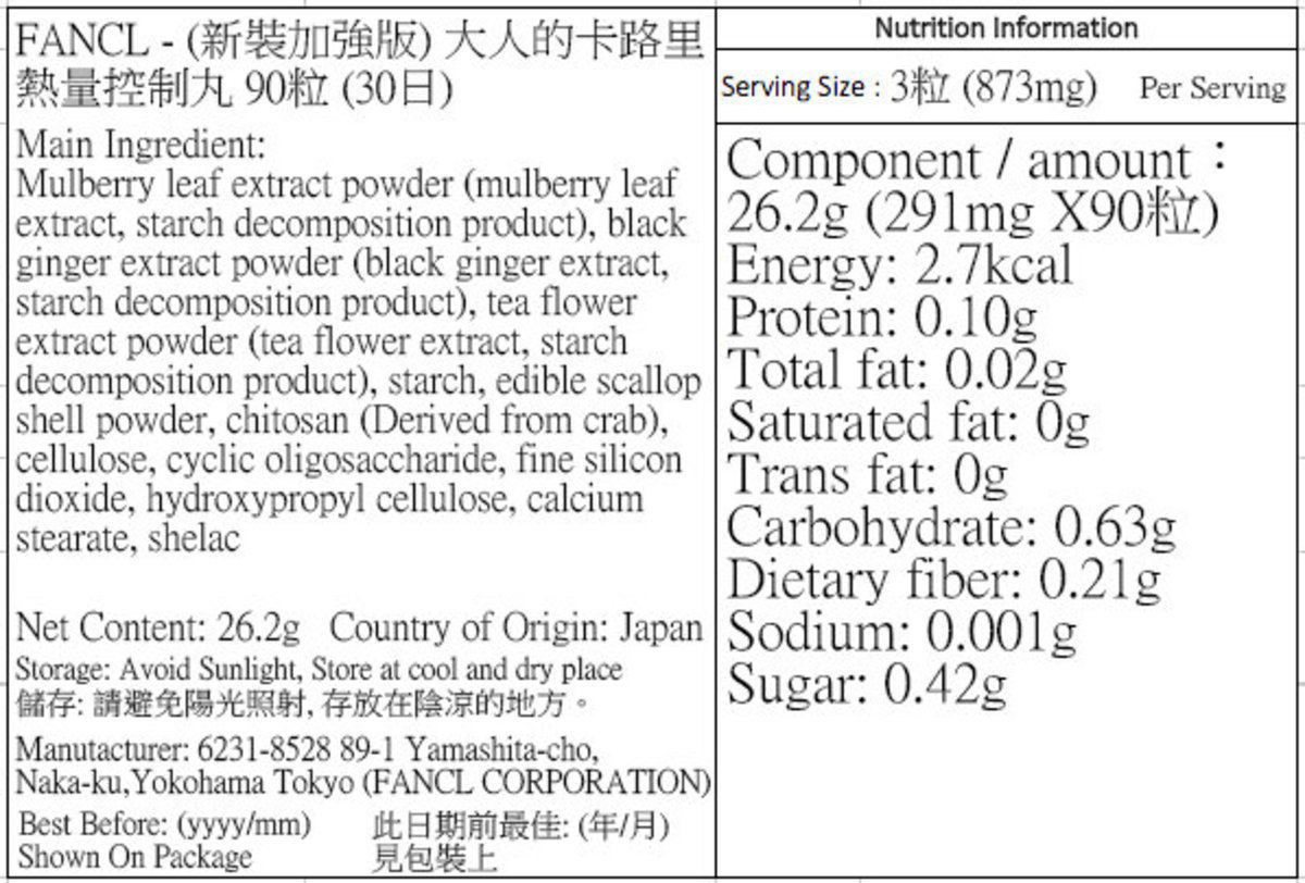Fancl熱量控制丸主要功能是由白芸豆精華減少澱粉質吸收,同時武靴葉和桑葉精華阻隔多餘吸收,丁香和蟹殼素有助避免吸收過量脂肪。