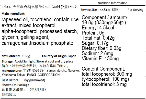 成分 :維他命 E(300– 生育酚當量毫克)、膠凝劑(明膠)、油菜籽油、水分保持劑(甘油)、小麥胚芽油