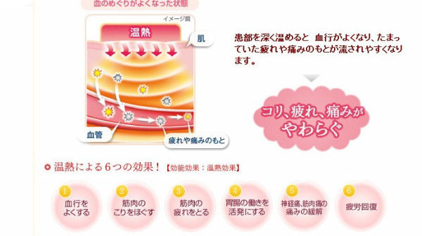 溫熱貼無任何氣味,每盒5片,采用伸縮材料制造,與肌膚緊密貼合,即使活動中也不容易脫落。由於溫熱效果對腰痛、腸胃肚子疼痛等有很好的幫助,有效加速血液循環,舒適身心。