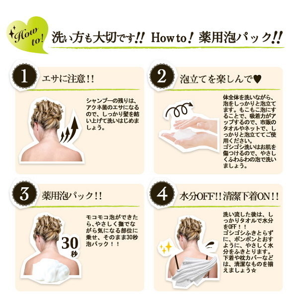 將肥皂加少量清水,在手心搓揉打出豐富泡沫(或可使用肥皂起泡網),將泡沫均勻塗抹於背部並停留30秒,用毛巾等輕揉效果更佳,其後用清水沖洗乾淨。
