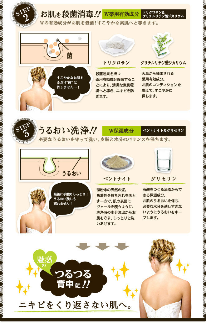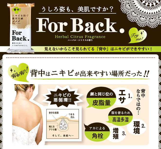 日本Pelican For Back背中藥用石鹼皂,主要含有木炭泥、木瓜蛋白酶、具有殺菌消毒效果的藥用活性物、Pen'naito粉末以及甘油等有效成分,可以有效清潔身體毛孔中的皮脂污垢、防止肌膚毛孔堵塞、軟化老舊角質,同時又能達到殺菌和預防身體粉刺與紅腫痘痘的效果。