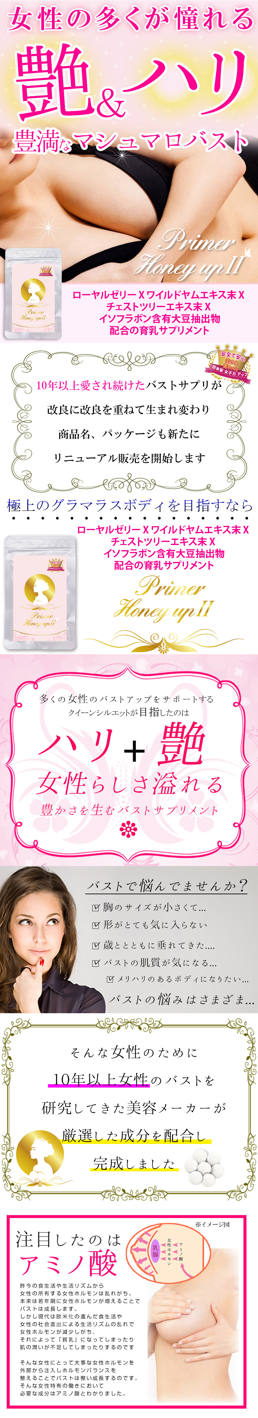 Primer Honey Up II 豐胸丸成份,比Royal Honey Up成份提升了,新添加 聖潔莓、大豆異黃酮、野生山藥、彈性蛋白肽等豐胸成份,效果更顯著。