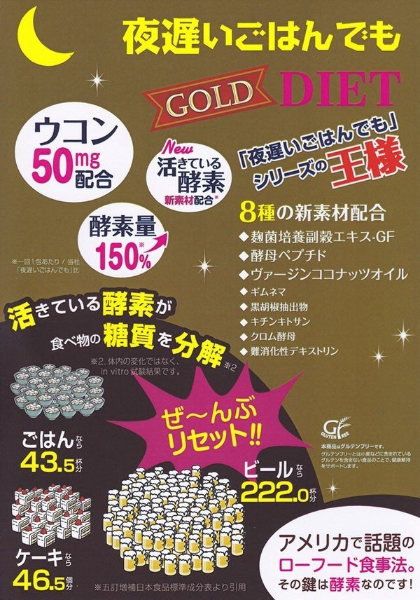 晚上不管多晚吃飯,有了它就不擔心了,對食生活不規律、總是在外面吃飯、總是很晚吃飯的你最合適。 三大功效----抑制糖份吸收;燃燒過剩能量;調整易瘦體質。 為日本新出的終極頂級版,酵素增量150%,400mg->610mg,加入8種新配方。
